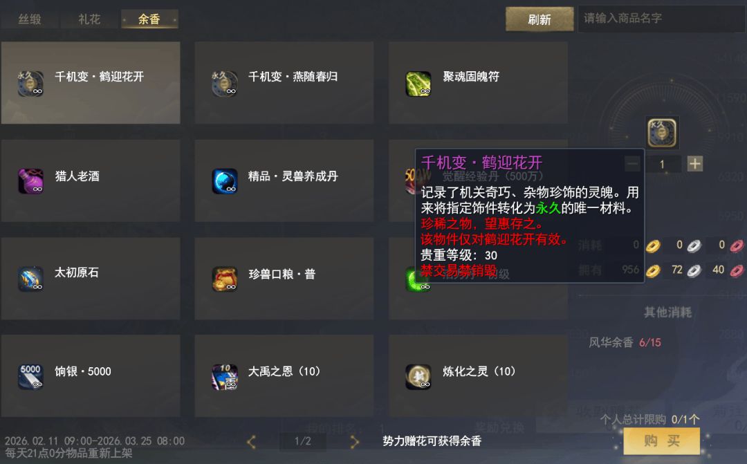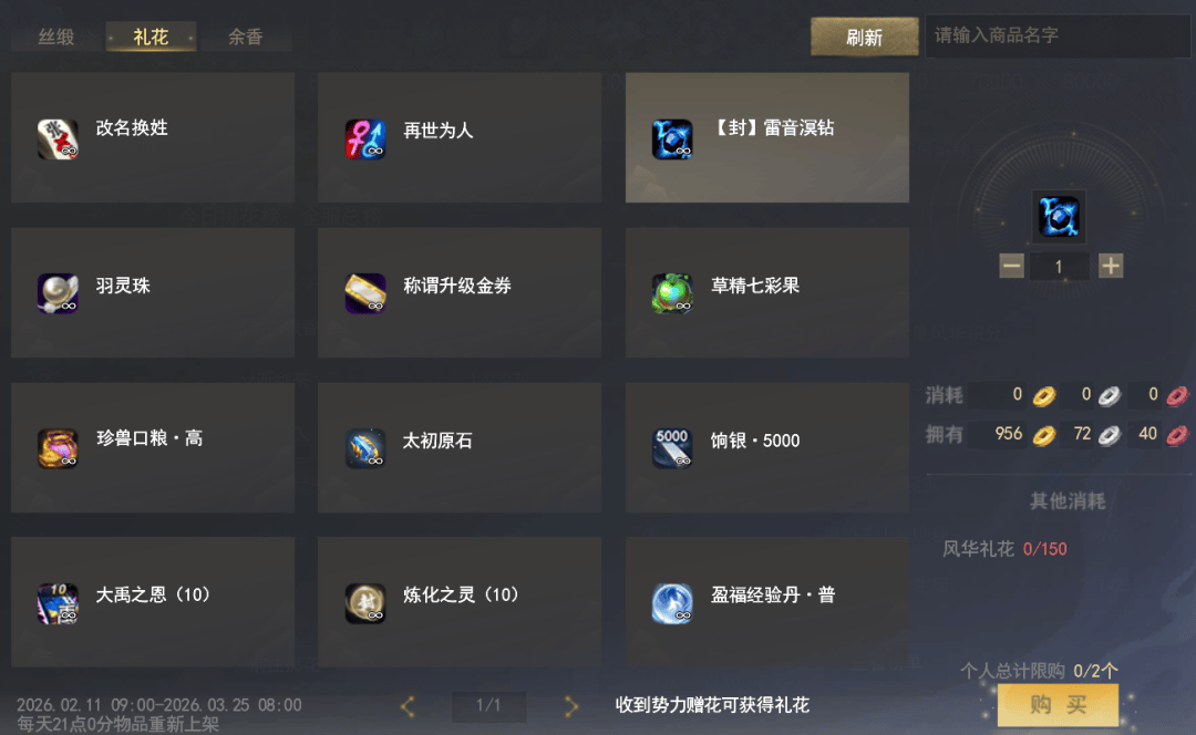 当少侠收到势力赠花时,就能获得风华礼花,用于兑换【封】雷音溟钻、改名换姓、再世为人、羽灵珠、草精七彩果、大禹之恩、太初原石等好礼。