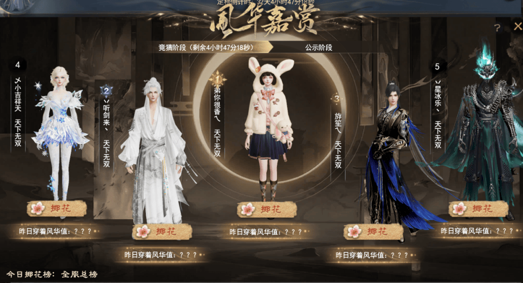 所有少侠每天可选择榜单上的一个玩家点击【掷花】,掷花后,可获得等同于其少侠穿着风华值的风华积分。需要注意的是,穿着的外观仅记录帽子、衣服、脸膜、光环、饰件这些部件,其余均不计分哦,大家在评估风华值的时候可要仔细观察啦!