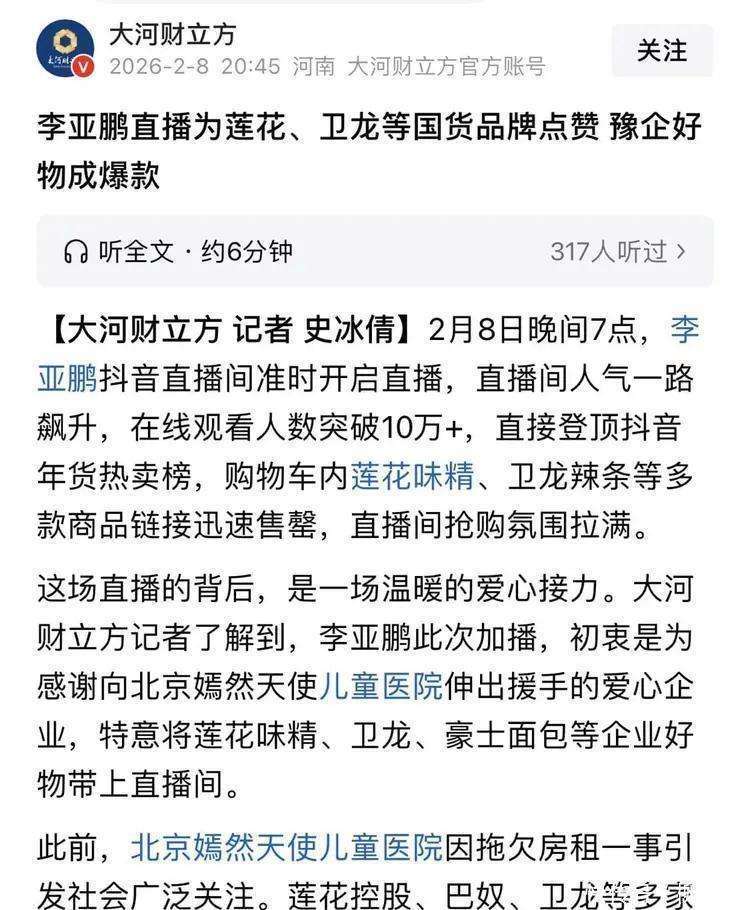 而这场热闹的直播背后,其实是一段温暖的爱心接力。据大河财立方记者了解,李亚鹏此次加播,初衷是感谢那些曾向北京嫣然天使儿童医院伸出援手的爱心企业。他特意将莲花味精、卫龙辣条、豪士面包等企业的优质商品带入直播间。此前,北京嫣然天使儿童医院因房租问题引发社会关注,多家河南企业如莲花控股、巴奴、卫龙纷纷伸出援手,为陷入困境的医院注入暖流,也让河南品牌的责任与担当被更多人看见。数据显示,李亚鹏在过去30天里共直播13场,上架商品874个,总销量超过百万,场均销售额在5000万至7500万之间。最近10天内,三场直播破亿,其中1月30日的销售额最高,超过1.8亿元。2月7日的达人榜上,李亚鹏超过与辉同行,排名第一。与此同时,他的短视频账号粉丝也从600万飙升到超过1100万,一个月涨粉近500万。对此,有网友评论道:愿意为李亚鹏的善良买单,买的是情怀,买的是他十多年坚持为唇腭裂孩子们做公益的辛劳,这样敢说敢做的人,在这个社会真的不多,值得敬佩和推广。有网友更直言,一个人做一件善事容易,但坚持20年做善事,就是活生生的菩萨。